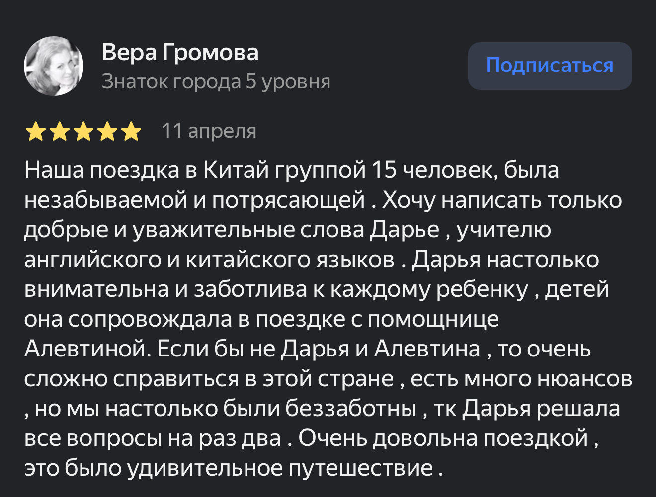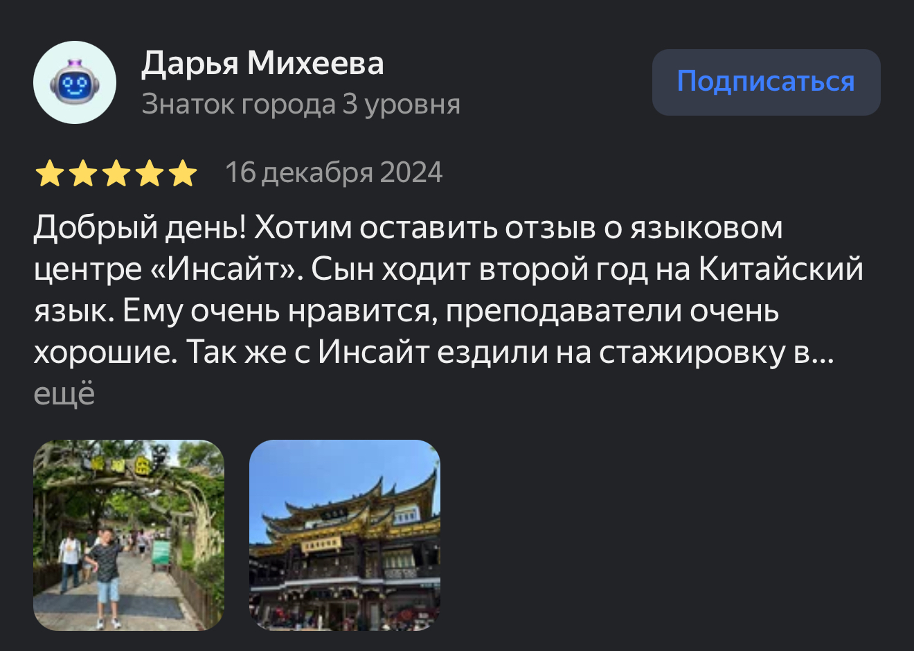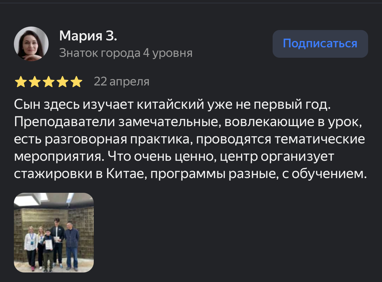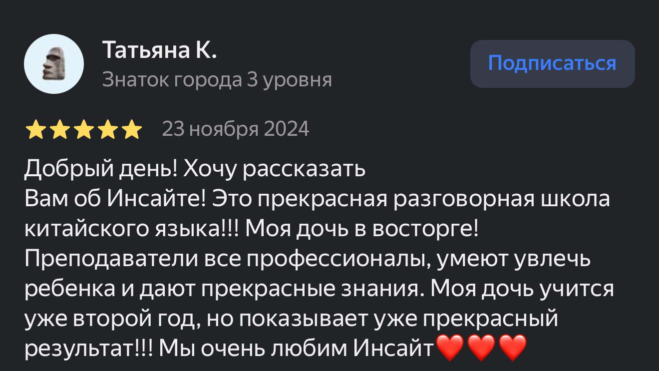 Дети, обучающиеся у нас, становятся призерами школьных олимпиад и международного конкурса чтецов, к которому мы особенно тщательно готовим ребят, оттачивая произношение и фонетику. Мы организуем летние программы полного языкового погружения для детей и подростков, а также языковые стажировки в КНР: Пекин, Шанхай, Ханчжоу и другие города Китая.